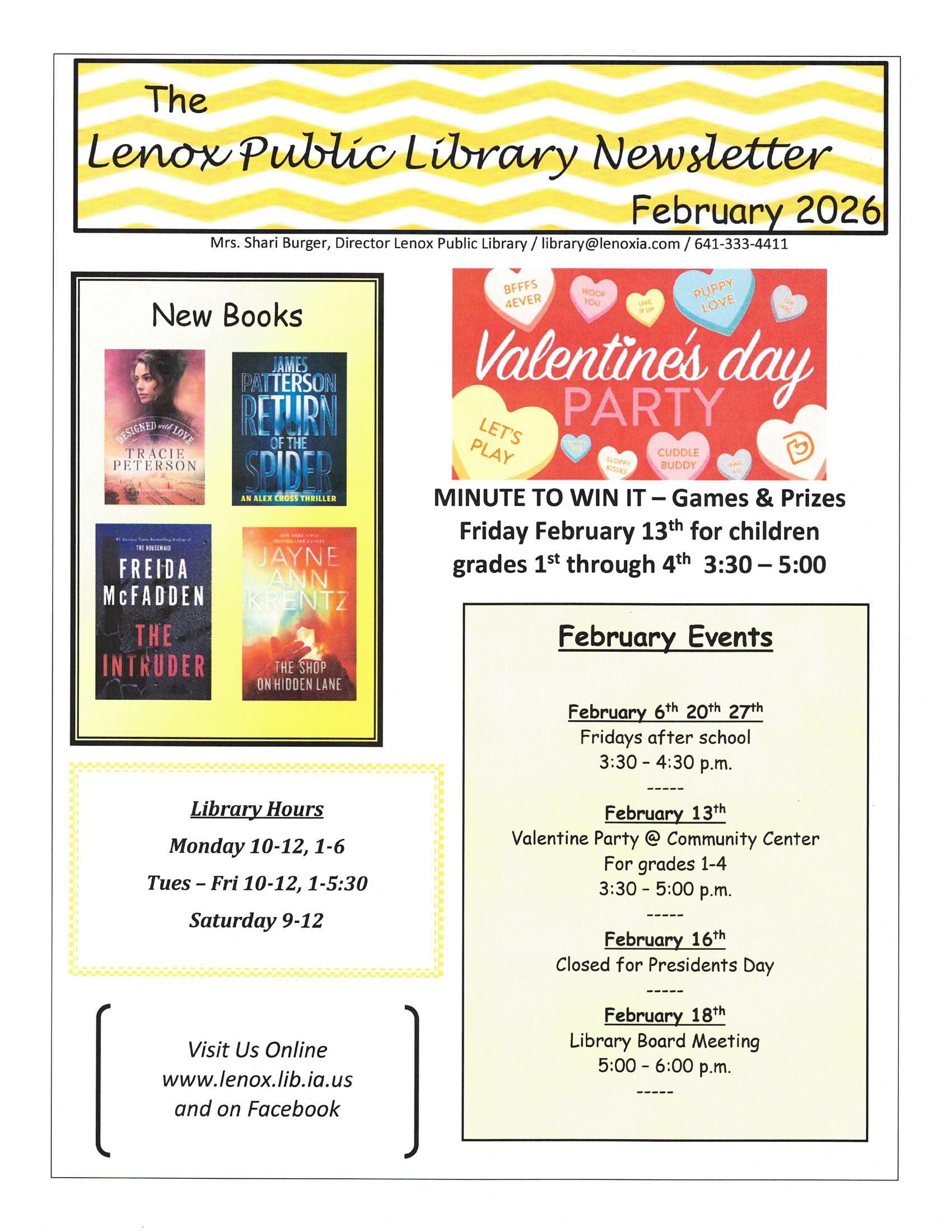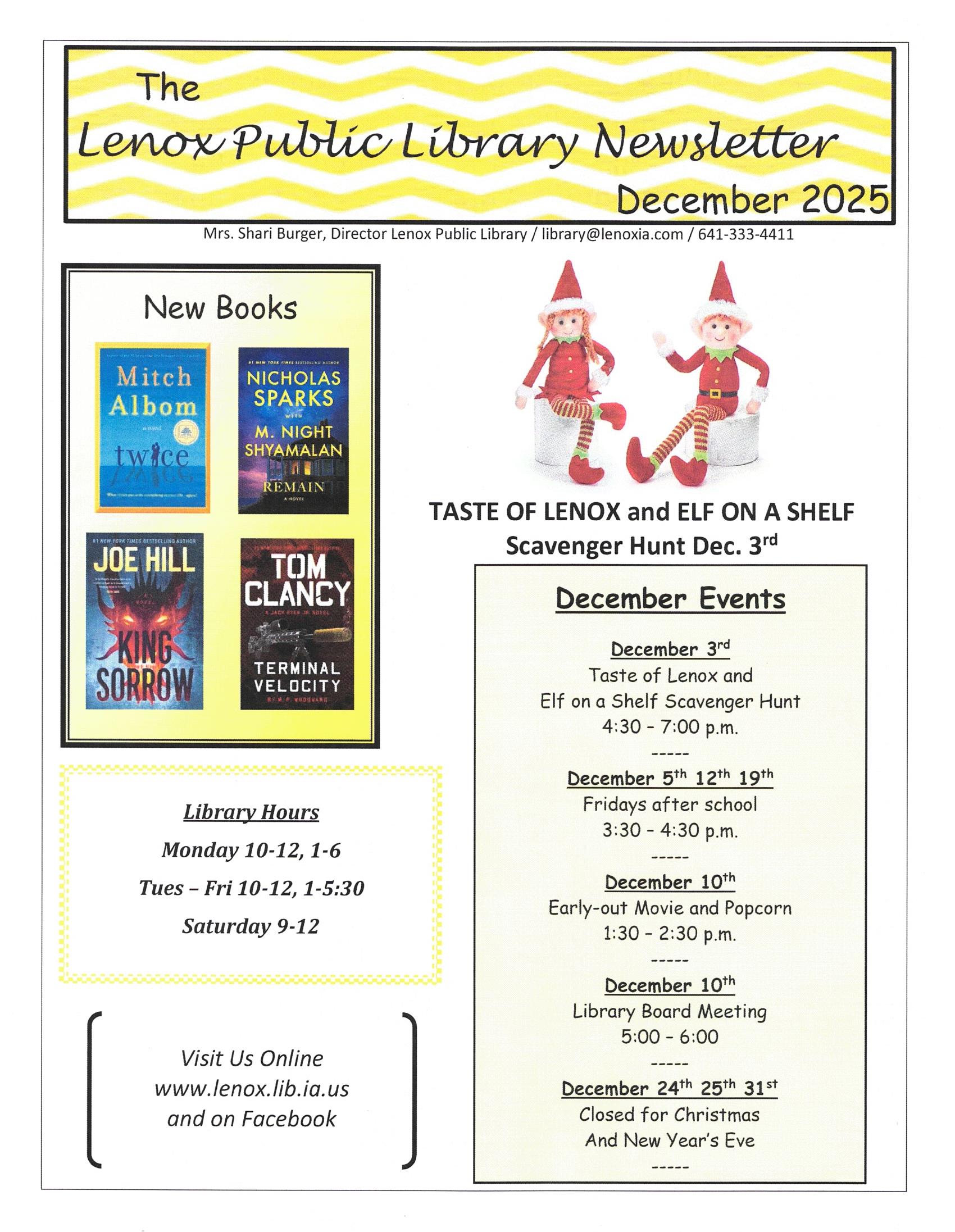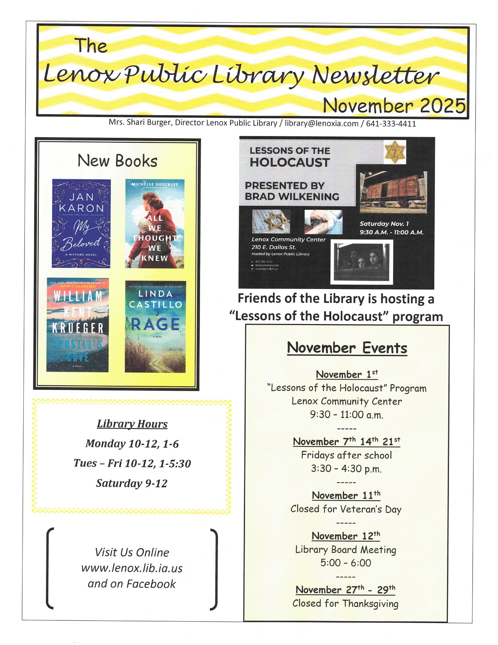 Welcome to the Lenox Public Library. The library is your one stop source for all of your informational needs. We have a large selection of books, and electronic resources available to be used by our library card holders.